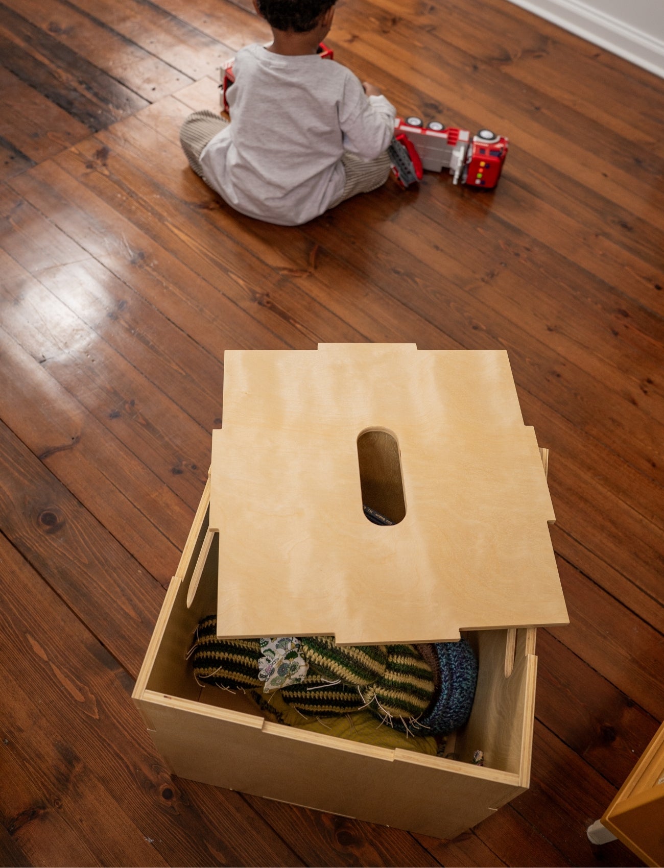 The beautiful and spacious storage box comes with a handy lid and rounded holes, which makes it easy for children to move around with their toys in their room or in the entire home. Cube Storage is perfect for keeping tidy, and orderly after play, for shoes in the hallway or small items that we all need as families. The decorative interior and portable storage box is a true winner when it comes to tidying up the home after playing with toys. Wooden Cube Storage can be used as a bedside table or as a seat anywhere in the home.