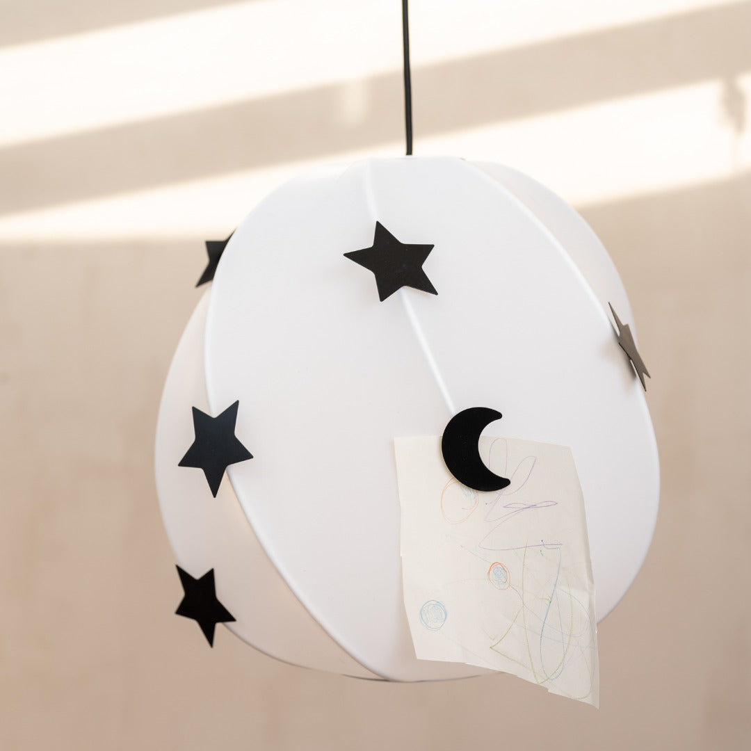 A timeless ceiling lamp where magnets can be used to hang drawings, pictures of best friends, or create a moon and stars night sky when looking up. It provides a practical play light for the children's room. When the child no longer desires the playful expression, it can transform into a classic lamp without magnets, suitable for use well into adulthood.