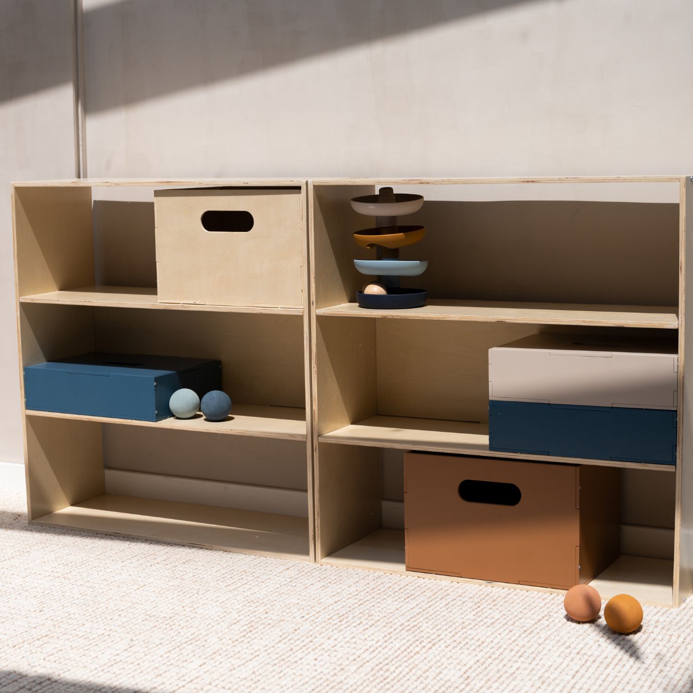 Kiddo shelving is a wooden shelf that can be assembled into a complete shelving system for the children's room, providing storage for toys and items and displaying favorite figures. The shelving system can be composed of modules according to space, needs, and desired expression.