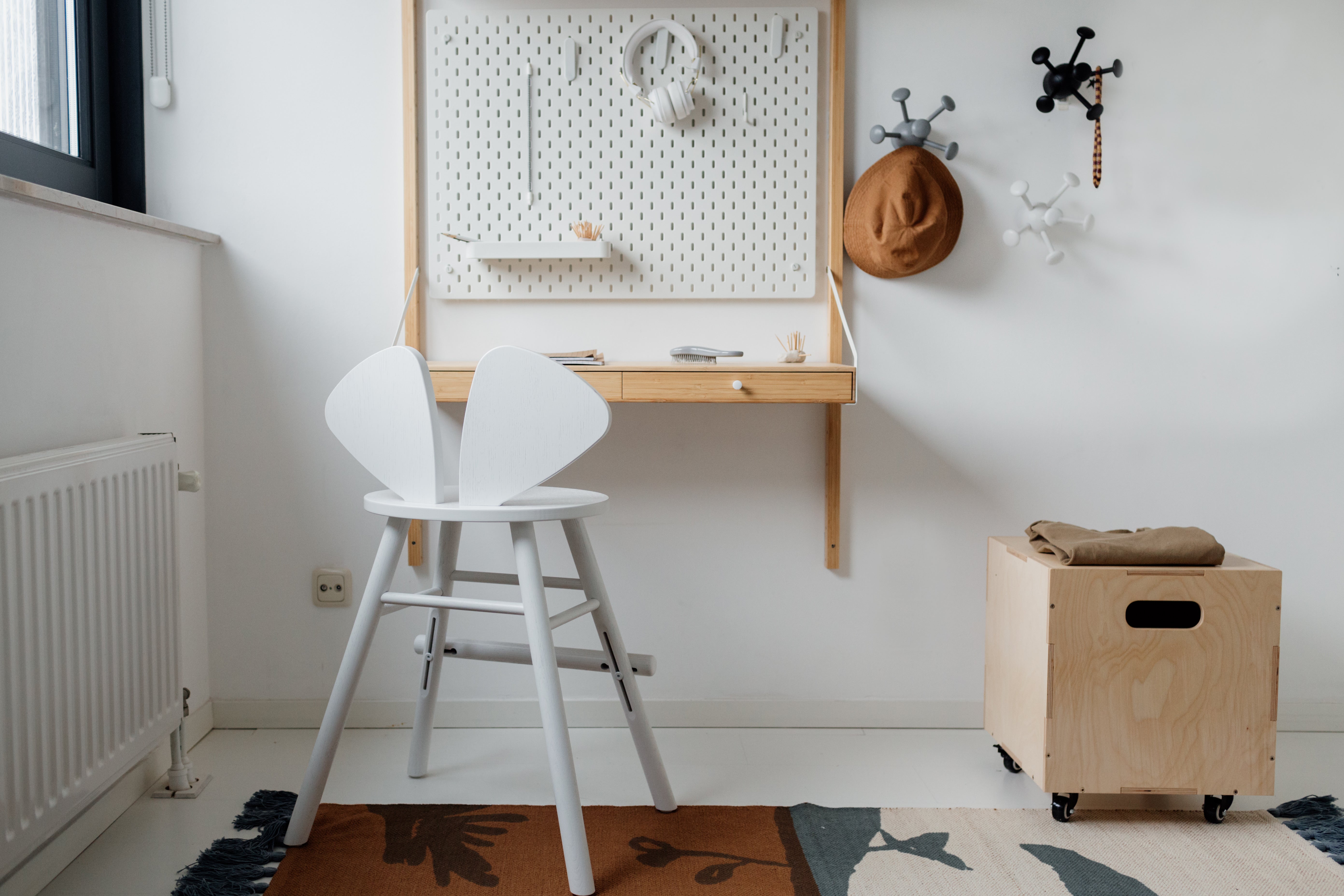Children's room with a white chair, wooden box, and wall-mounted desk.