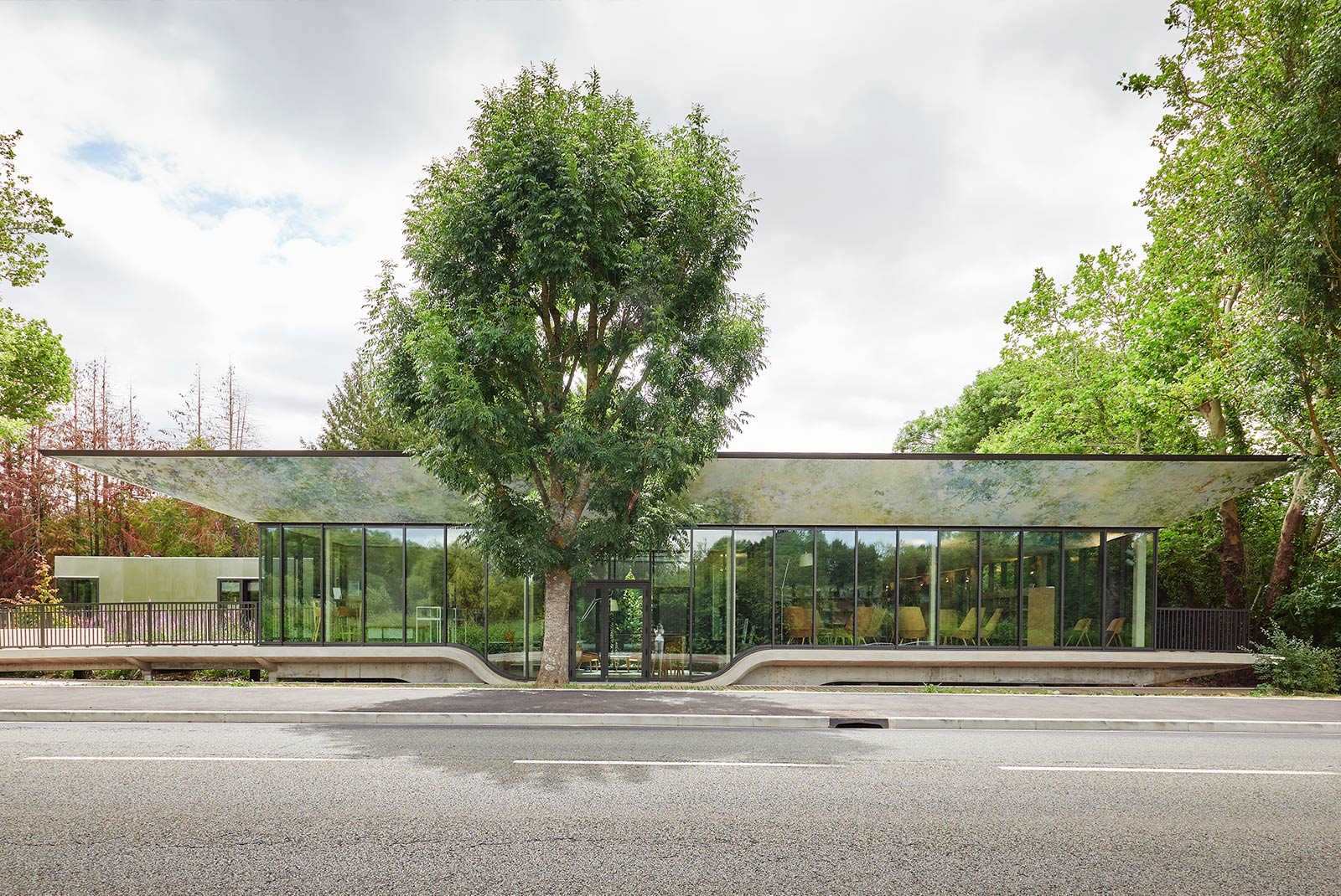 At the edge of Avenue de la Prairie, elevated on stilts, the building hovers between land and water.